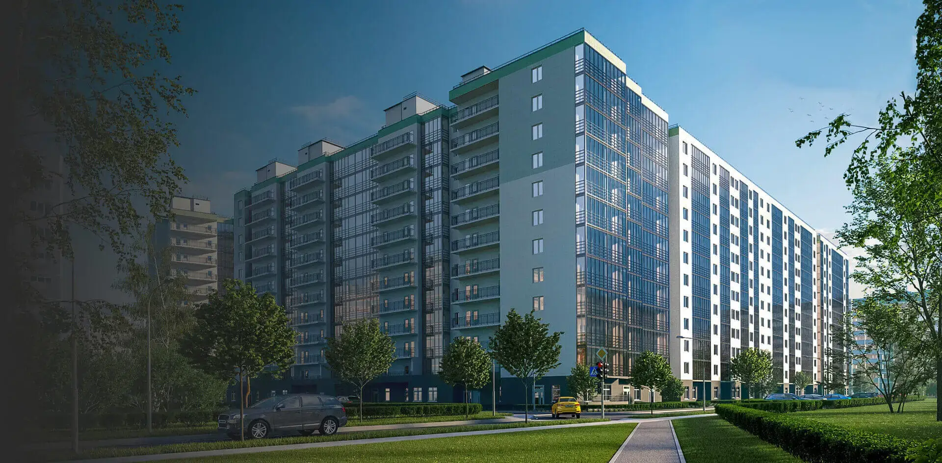 Территория Жилого Комплекса включает в себя ряд домов в едином стиле. Все подъезды оборудованы скоростными бесшумными лифтами и системами безопасности. Авторский дизайн входных групп создает ощущение комфорта и уверенности.
